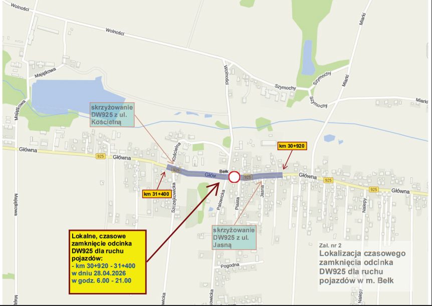 - Realizacja bitumicznych robót nawierzchniowych pełną szerokością jezdni DW925 na zamkniętym dla ruchu odcinku w km 30+920 ÷ 31+400 w m. Bełk (od lokalizacji Punktu Aptecznego „Margaretka” w okolicach skrzyżowania z ul. Jasną do lokalizacji