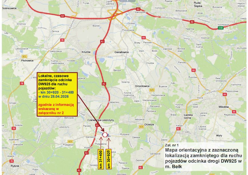 Firma Strabag Infrastruktura Południe Sp. z o.o. - Wykonawca robót na zadaniu pn. „Przebudowa drogi wojewódzkiej nr 925 od granicy miasta na prawach powiatu Ruda Śl. - A1 - do granicy miasta na prawach powiatu Rybnik” informuje o lokalizacji i terminie czasowego zamknięcia dla ruchu pojazdów odcinka drogi DW925, na którym będą realizowane roboty bitumiczne z wykorzystaniem pełnej szerokości jezdni w m. Bełk.