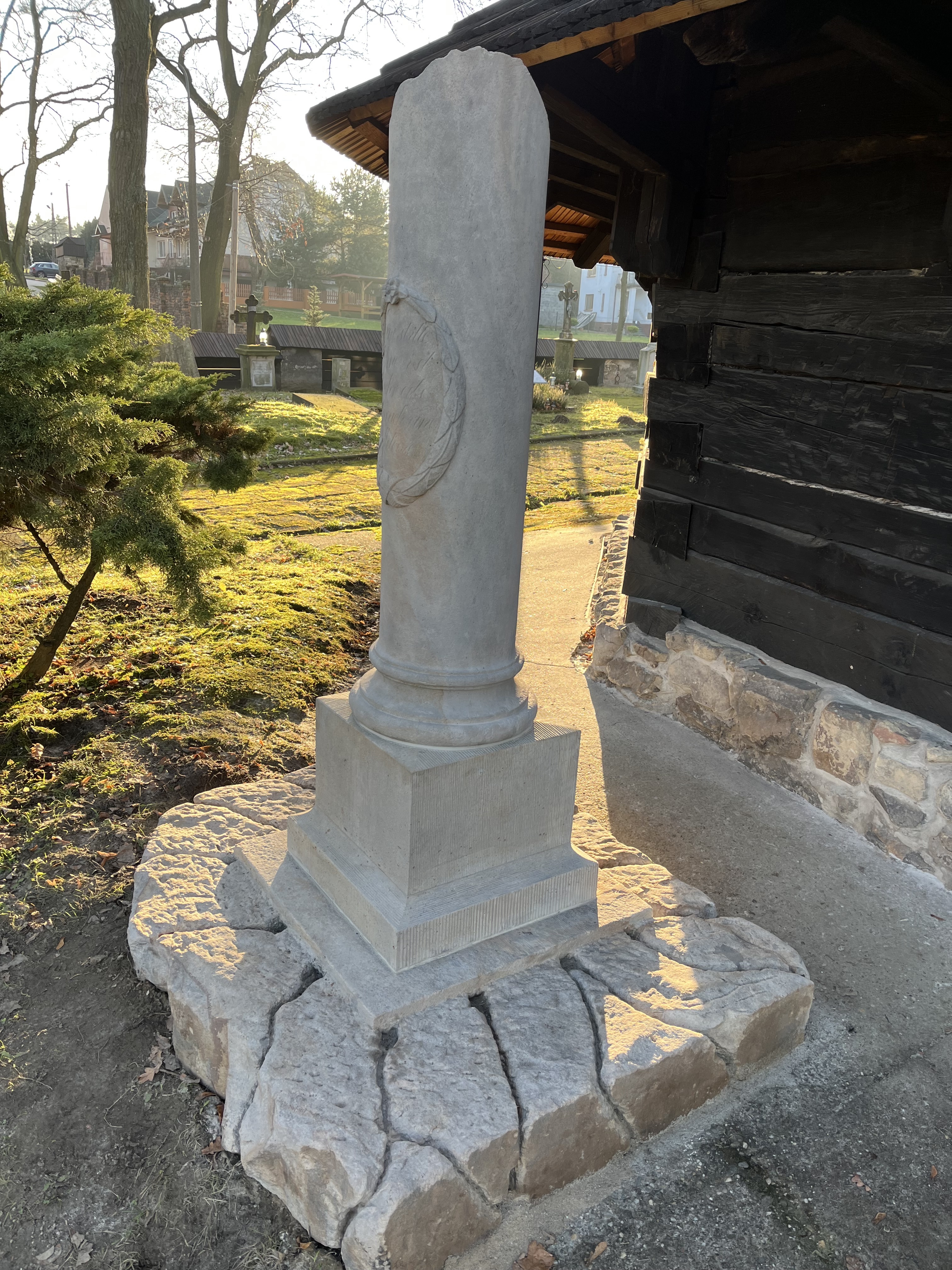 - odrestaurowanie symbolicznego nagrobka na starym cmentarzu - złamana kolumna, która jest jednocześnie grobem symbolicznym (cenotaf) będącym formą upamiętnienia osoby pochowanej w innym miejscu. Została ona ufundowana przez Richarda Holtze, jednego z założycieli Miasta Katowice, ku czci swego ojca, Fryderyka Holtze. Na kolumnie umieszczono płaskorzeźbę w postaci owalnego wieńca z liści laurowych przewiązanych wstęgą w części dolnej, z rozetką w części górnej. W środku wieńca napis: "Eine stille Tröhne ist mehr als Spruch und Melodie" - Cicha łza to coś więcej niż wiersz i melodia. Z uwagi na fakt, iż Richard Holtze należał do loży wolnomularskiej (Loge zum Licht im Osten zu Kattowitz), uważano tę złamaną kolumnę jako symbol masoński, który oznaczał upadek człowieka7. Ciekawą historię o tej kolumnie przedstawił ks. Rudolf Kiera (proboszcz w Bełku w latach 1970-1991): "To jest znak pogański i nawet proces w tej sprawie się odbywał. Syn Holtzego przegrał i musiał nagrobek usunąć. Pod płot to ktoś rzucił. Znalazłem ten pomnik i dokumenty z procesu, a że obowiązuje nas wszystkich ekumenizm, ustawiłem złamany posąg właśnie w tym miejscu"8.
